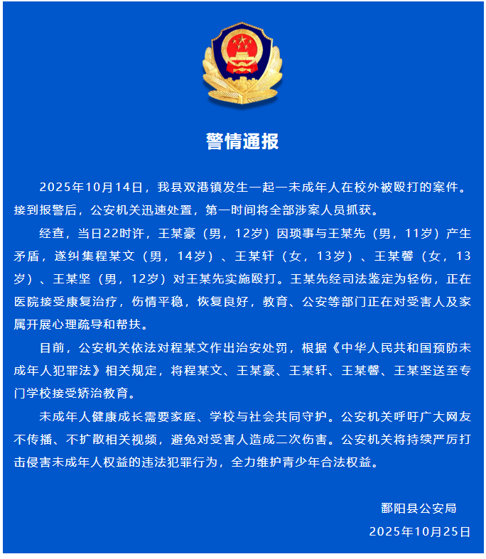新京报讯10月25日,江西鄱阳县公安局发布警情通报,2025年10月14日,该县双港镇发生一起一未成年人在校外被殴打的案件。接到报警后,公安机关迅速处置,第一时间将全部涉案人员抓获。